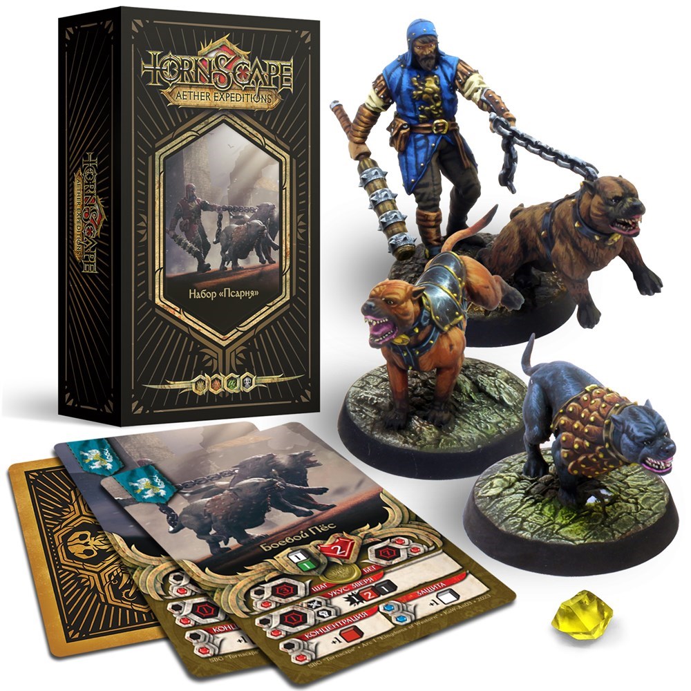 Miniatures “Engeln’s Houndmaster” and “Battle Dog” for the tabletop game Tornscape. This set includes parts to assemble the miniatures, 32 mm scenic bases, Miniature Cards, and a random Divine Intervention Card (Creation).