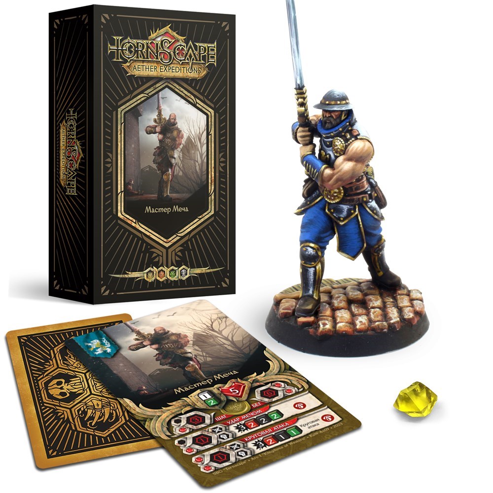 Miniature “Swordmaster” for the tabletop game Tornscape. This set includes parts to assemble the miniature, a 32 mm scenic base, a Miniature Card, and a random Divine Intervention Card (Creation).