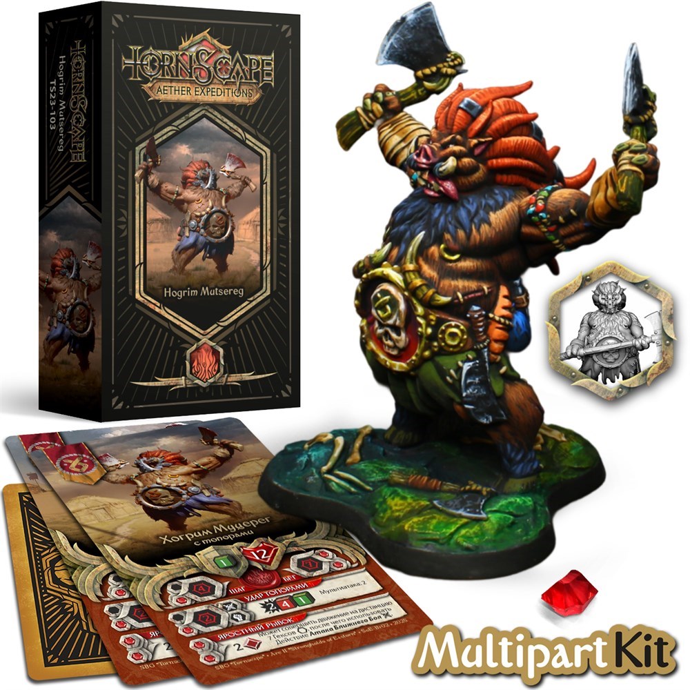 Miniature “Hogrim Mutsereg” for the tabletop game Tornscape. This set includes parts to assemble the miniature, a triple scenic base, Miniature Cards, and a random Divine Intervention Card (Destruction).