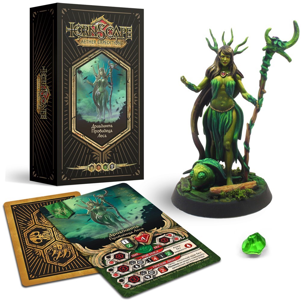 The Dryadint Seer of Forest miniature for the tabletop game Tornscape. This set includes parts for assembling the miniature, a 32 mm scenic base, the miniature card, and a random God Card (Life).