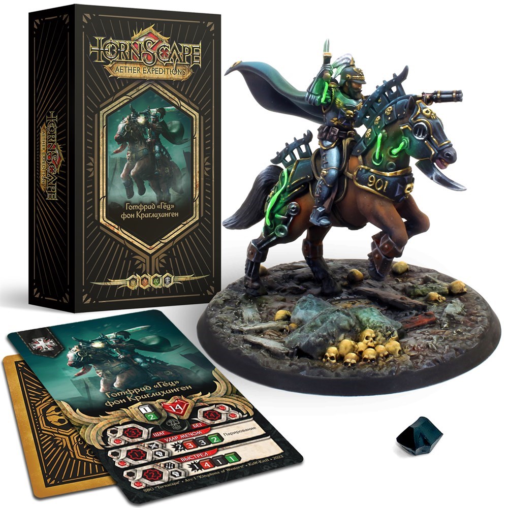 The “Gottfried ‘Götz’ von Kriglichingen” miniature for the tabletop game Tornscape. This kit includes parts for assembling the miniature, an 80mm base, a Miniature Card, and a random God Card (Death).