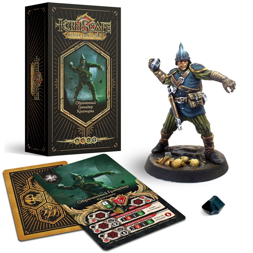 The “Doomed Grenadier” miniature for the tabletop game Tornscape. This set contains parts for assembling the miniature, a 32mm base, a Miniature Card, and a random God Intervention Card (Death).