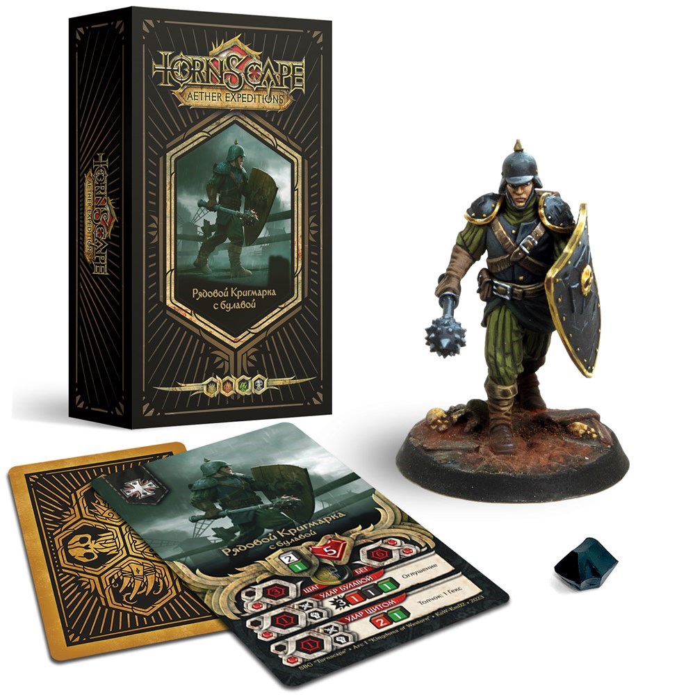 The “Line Soldier with Mace” miniature for the tabletop game Tornscape. This set contains parts for assembling the miniature, a 32 mm base, a Miniature Card, and a random Death Divine Intervention Card.