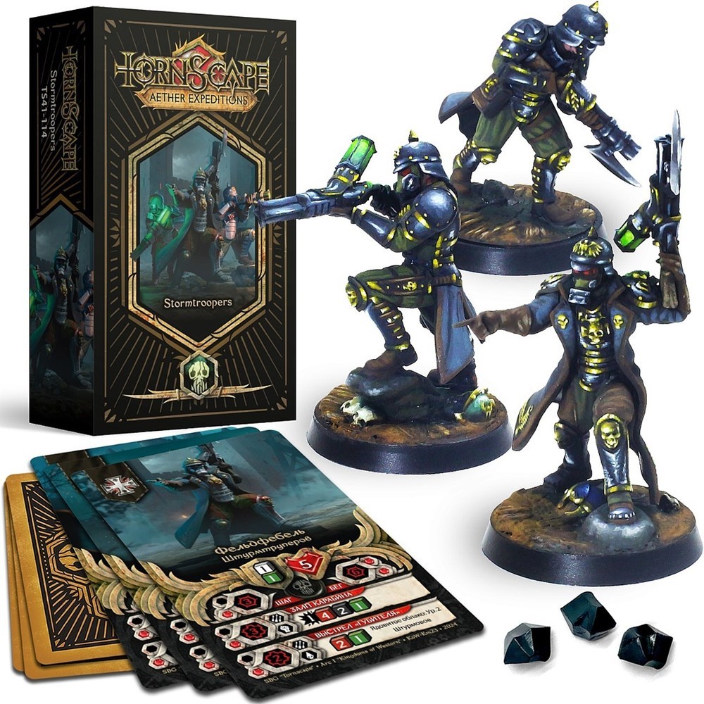 Miniatures from the Stormtroopers set for the tabletop game Tornscape. This set contains ready-to-play miniatures, Miniature Cards, and random Death God Cards.